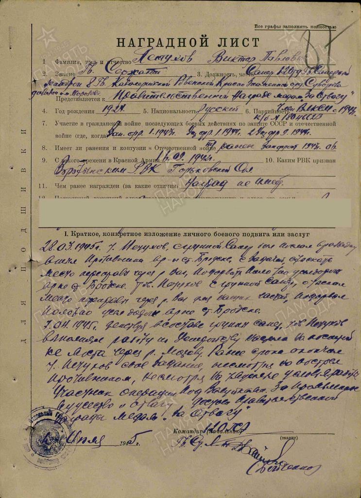Есть события, над которыми не властно время, они навсегда останутся в народной памяти. Именно таким событием является Великая Отечественная война 1941-1945 годов. Каждую весну мы все живем в преддверии праздника Победы, 80 годовщину которой мы отмечаем в этом году. Десятилетия отделяют нас от событий тех лет, но потомки всегда будут помнить то драматическое и героическое время, всегда будут чтить тех, кто отдал свою жизнь, здоровье за свободу нашей Родины. Наш коллектив тоже не остался в стороне. В память о Великом подвиге предков мы начинаем цикл публикаций, посвященный нашим героическим родным! Петухов Виктор Павлович 1923-14.03.2012 Родился в селе Васильевское, в 1923 году. В августе 1942 года был призван Воротынским Райвоенкоматом Горьковской области, и по приказу направлен в Ковровский военный лагерь, в запасной кавалерийский полк, в химический эскадрон, где проходил военную и строевую подготовку. После учения он вместе с товарищами отправлен во второй Украинский фронт по направлению – Харьков, под командование маршала Малиновского, в 31 гвардейский кавалерийский полк в восьмую Кубанскую дивизию. Виктор Павлович участвовал в освобождении Будапешта, Венгрии, Чехословакии. Участвовал в перехвате вражеских соединений вместе с чешскими партизанами. Война кончилась в 1945 году, но Виктор Павлович с товарищами и вся Кубанская дивизия была послана в Западную Украину на усмирение бандеровцев. Имел легкие ранения, контузию. Домой вернулся 27 апреля 1947 года. Имеет награды: «Медаль за отвагу», юбилейные медали: Медаль за победу над Германией в ВОВ 1941-1945 гг., Ветеран Труда. Был отмечен за труд Похвальными грамотами. Подвиг: ![]() |